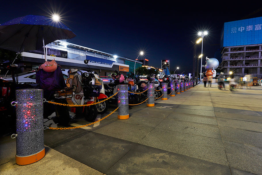 新型路障石材具有擋車功能,提升場所的形象和安全性,夜晚展現出特別絢麗的效果